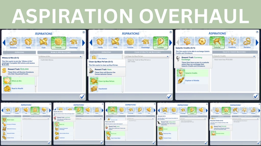 The aspiration overhaul mod adds new aspirations to your sims 4 game and changes the existing aspirations from the game. Now all aspirations will only have one milestone and most of them have one goal. When your sim completes an aspiration they will receive 3500 satisfaction points and a reward trait.
